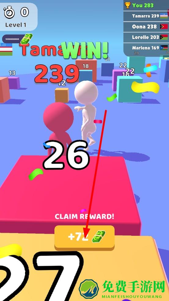 3、倒计时归零后,依据头顶数字总和判定最终排名,点击CLAIM REWARD按钮领取金币资源,用于升级攻击、移动速度,或解锁新颖火柴人皮肤。