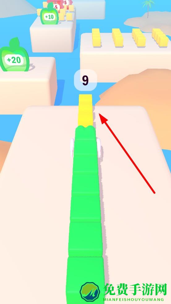 2、遇断裂路面需用方块长度搭桥,经过增益门,增加自身长度,长度不足则会掉落,则游戏失败,