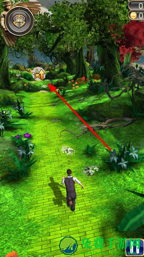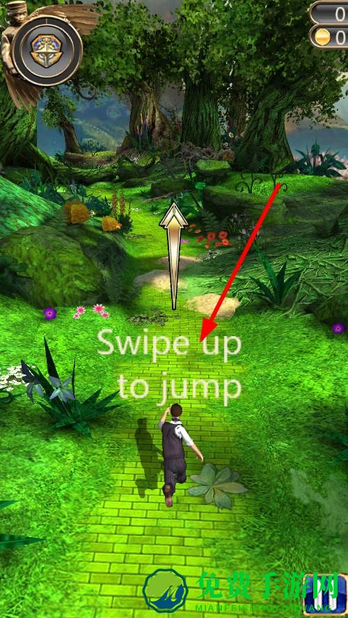 1、进入游戏后,教程以动态箭头,配合文字提示Swipe up to jump,上划后,角色做出双臂上扬,避开前方的树根障碍。