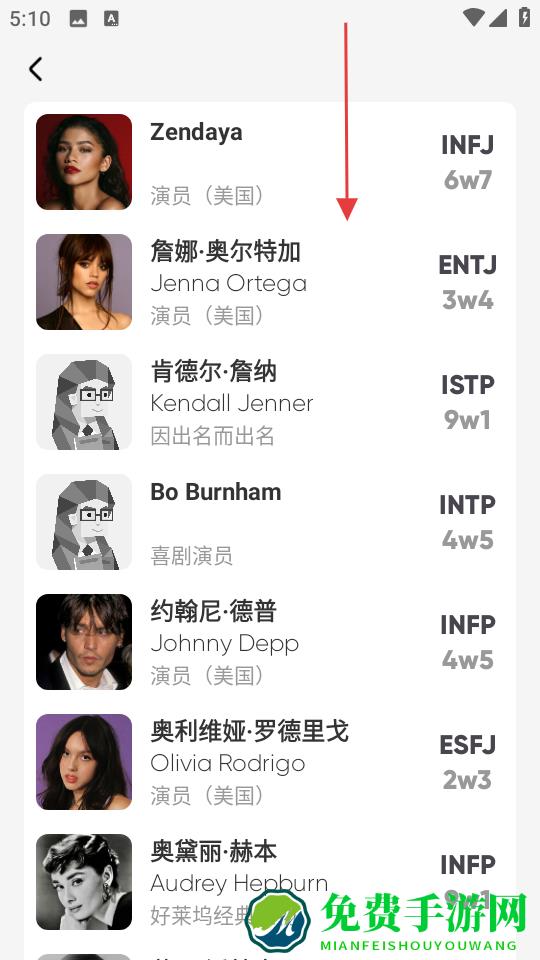 2、这个列表把明星的MBTI和九型人格都列在一起了,像Zendaya是INFJ这种信息一眼就能看到,每个人的职业和国籍也标得很清楚,追星的时候顺便还能学点心理学知识。