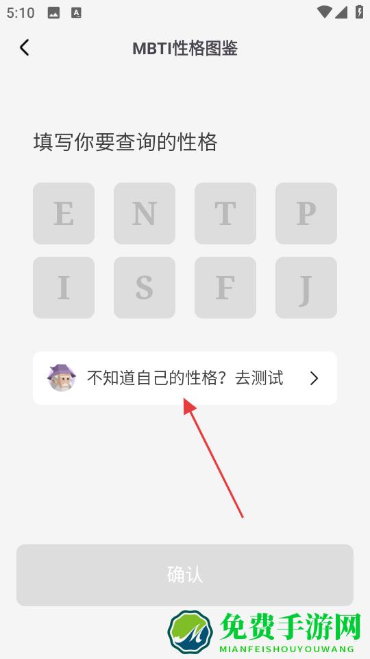 3、要是不知道自己的性格类型,点那个带箭头的大白按钮就能直接跳转到测试页面,八个字母按钮排得整整齐齐的,选好性格维度后点确认就行。