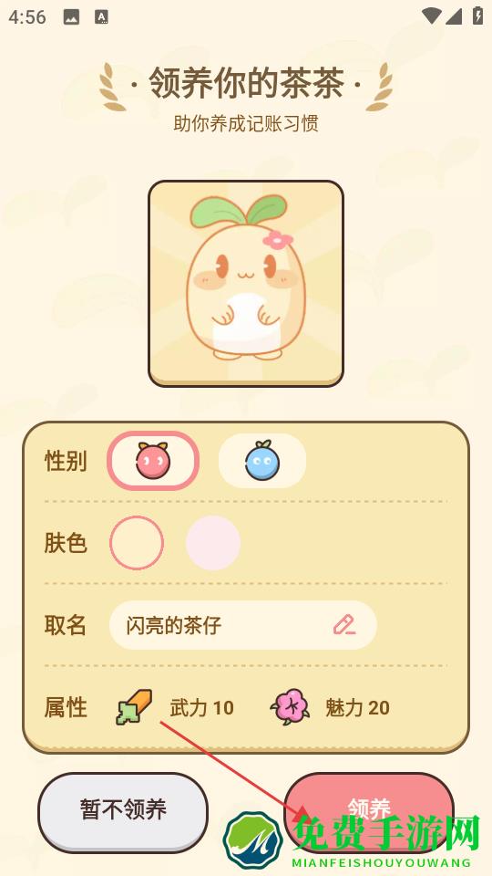 1、自定义你的记账小助手,从性别到肤色都能按自己喜好来选,领养按钮特意用了醒目的红色,搭配那个萌萌的茶茶形象,让人忍不住想马上领回家陪自己记账。
