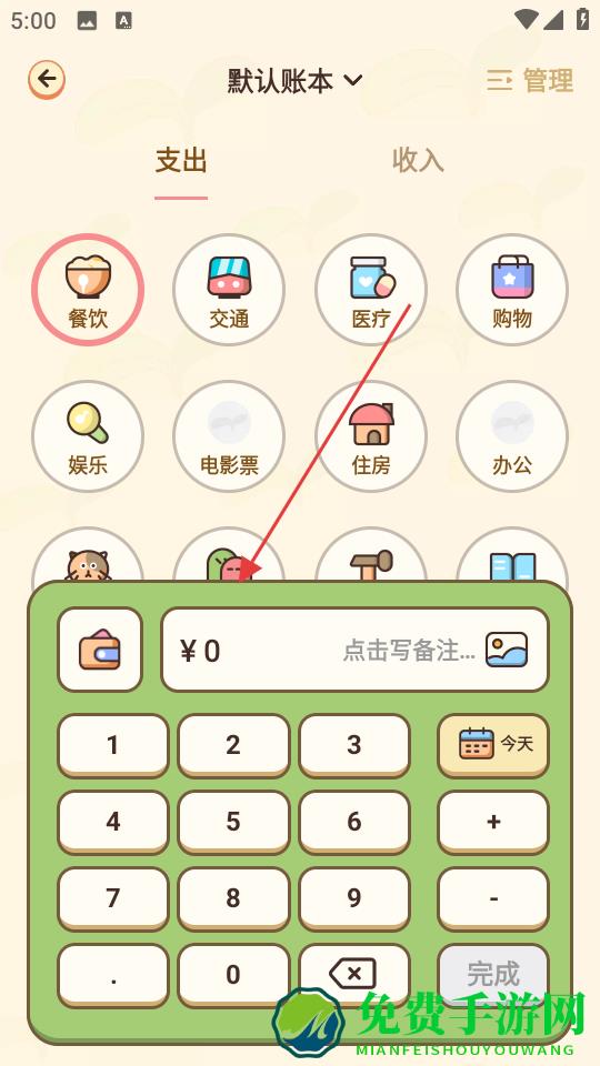 2、支出分类做得特别直观,餐饮那个图标被红圈标出来,一眼就知道现在记的是吃饭的花销,下面的数字键盘超大个,输金额时不容易按错,写完还能加备注。