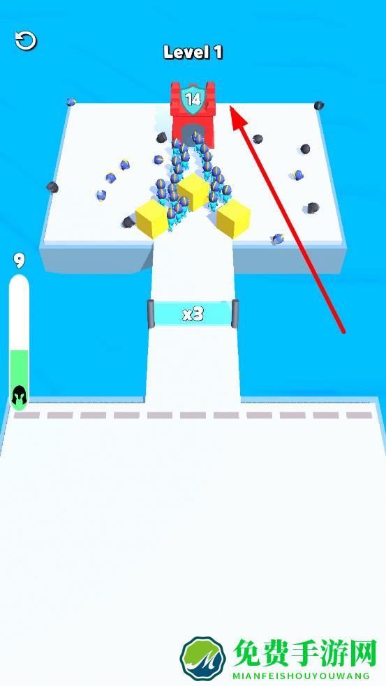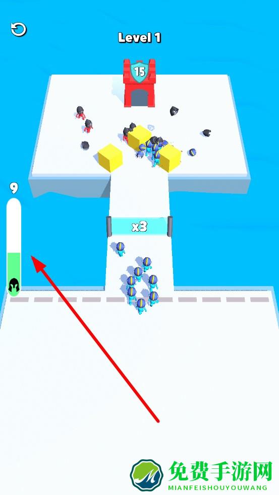 1、进入关卡后,左侧进度条每格对应可召唤兵力,点击即可召唤小兵;留意路径上的倍增门,引导小兵经过,扩充军团。