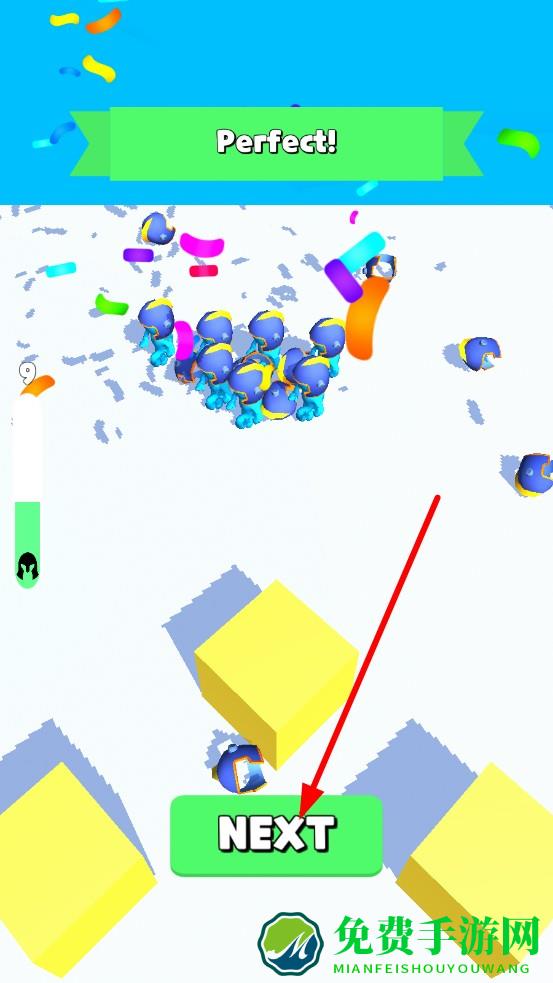 3、击溃屏幕内所有红色守卫后,将蓝色小兵集中引导至顶部红色城堡,持续攻击直至城堡血量归0,待弹出Perfect特效,点击NEXT按钮解锁下一关。