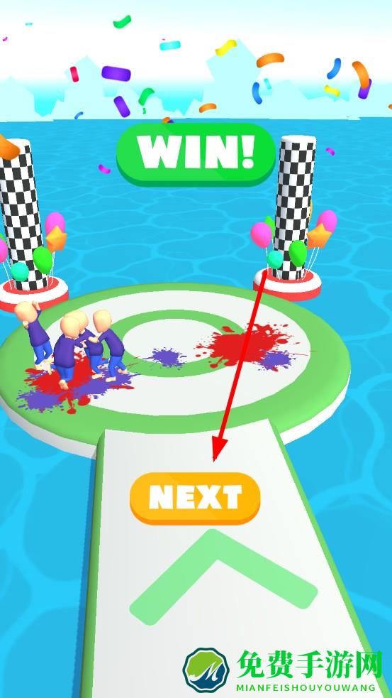 3、抵达终点平台后,指挥蓝色军团围攻红色守卫,人数占优后将其击溃;画面弹出WIN!,点击NEXT进入下一关,解锁更复杂地形挑战。