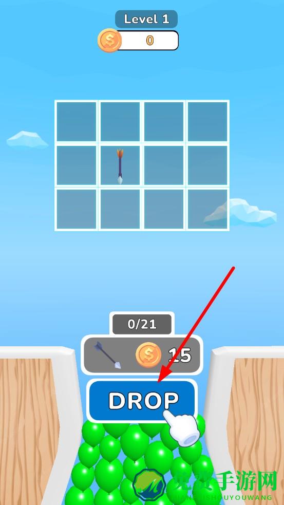 1、进入关卡,上方网格陈列箭头、炸弹等初始道具,点击网格选道具,或耗金币点绿按钮换更强道具,确定后按蓝DROP,弓箭从网格坠落。