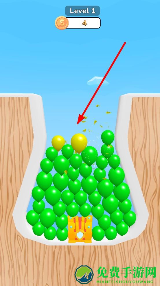 3、宝箱惊喜:底部宝箱被气球盖着,戳破最上层中间的黄球等特定位置,能提前解锁宝箱,爆出金币瀑布。似在气球堆挖财富密码,重玩就为找宝箱触发点,惊喜感直接拉满。