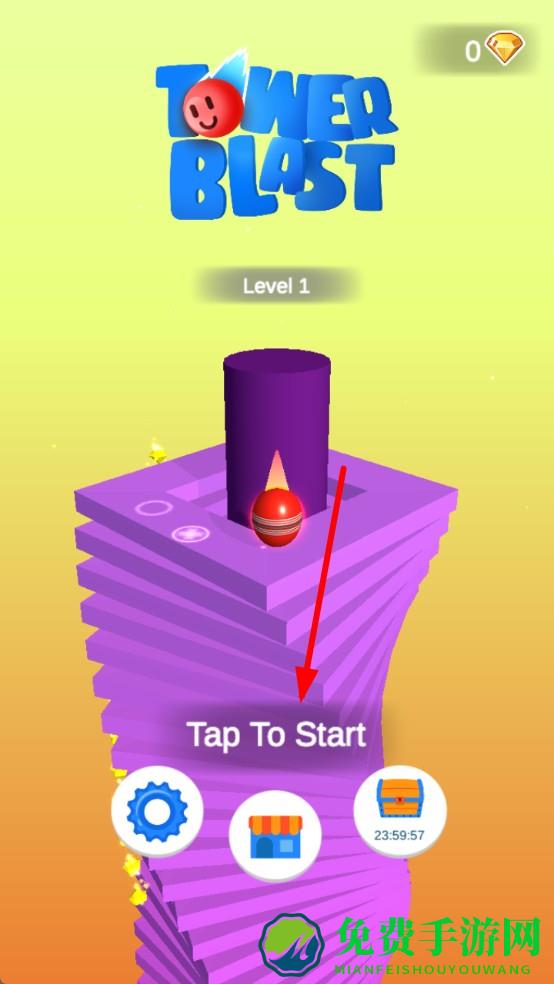 1、启动界面点击Tap To Start,红球被底部火焰弹出,沿螺旋塔开始坠落。塔层呈紫色螺旋堆叠,红球砸中即粉碎一层。