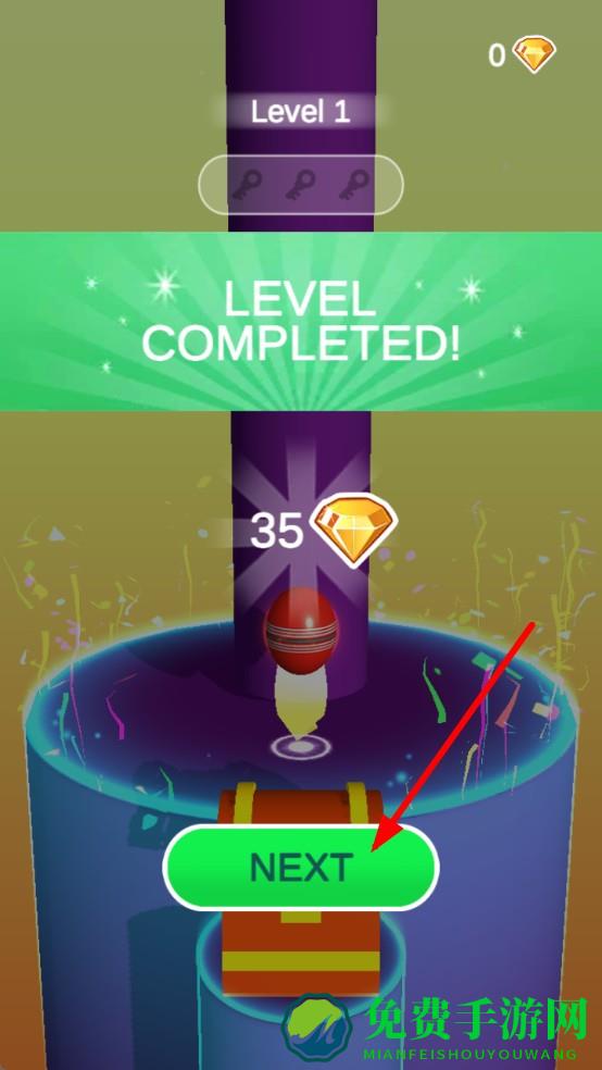 3、红球抵达塔底后,屏幕弹出LEVEL COMPLETED,收获钻石奖励;点击NEXT进入新关,后续塔层螺旋更扭曲,挑战逐步升级。