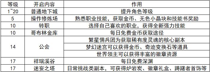 主要为练级,10级开启的哥布林金库可获得金币,14级的公会地下城繁星佣兵团可获得稀有度灵魂,17级的祥瑞溪谷可获得史诗装备。