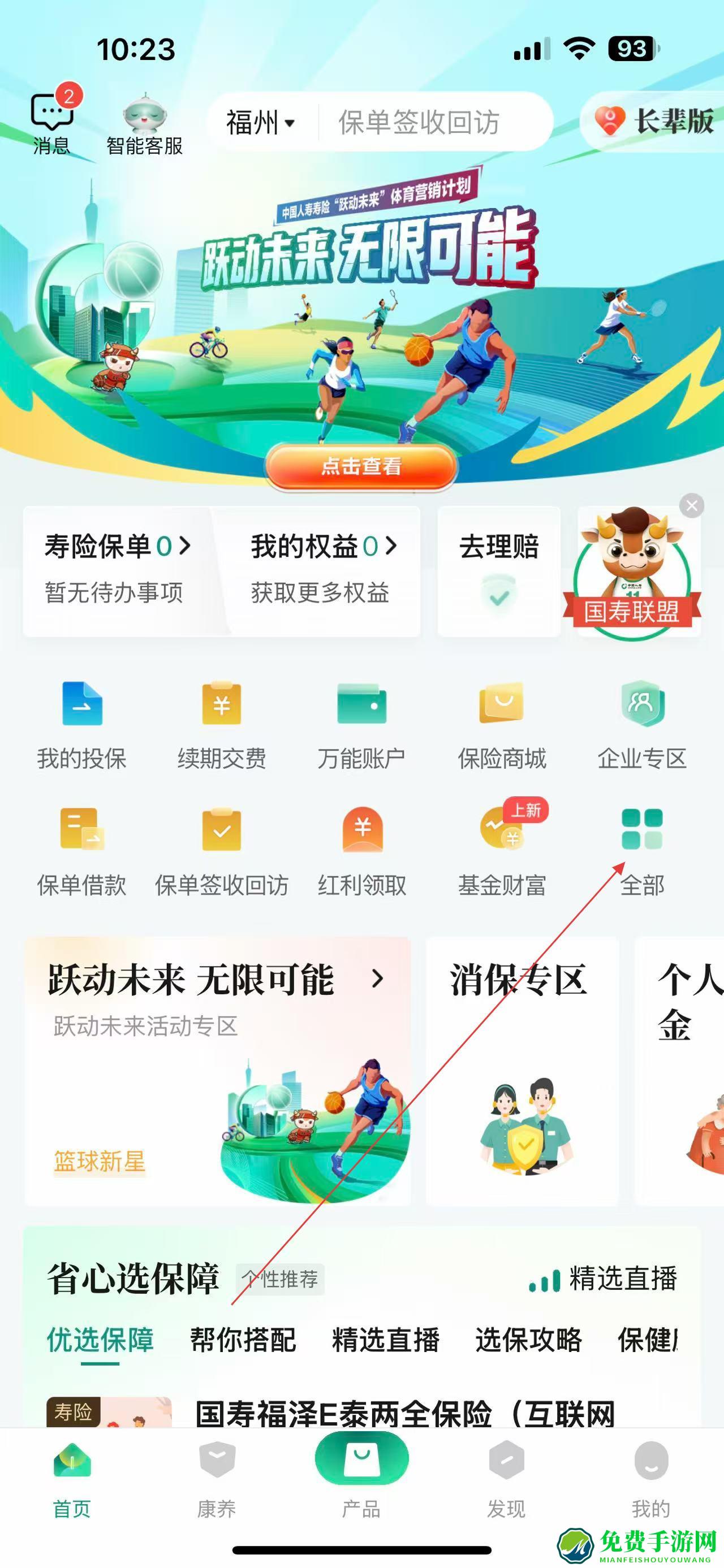 1、打开中国人寿寿险APP,进入首页,点击首页中的全部按钮,进入全部应用页面,在这里可以找到各类服务功能入口。