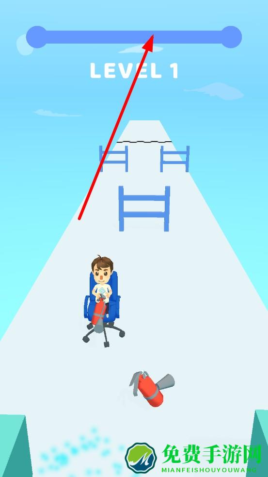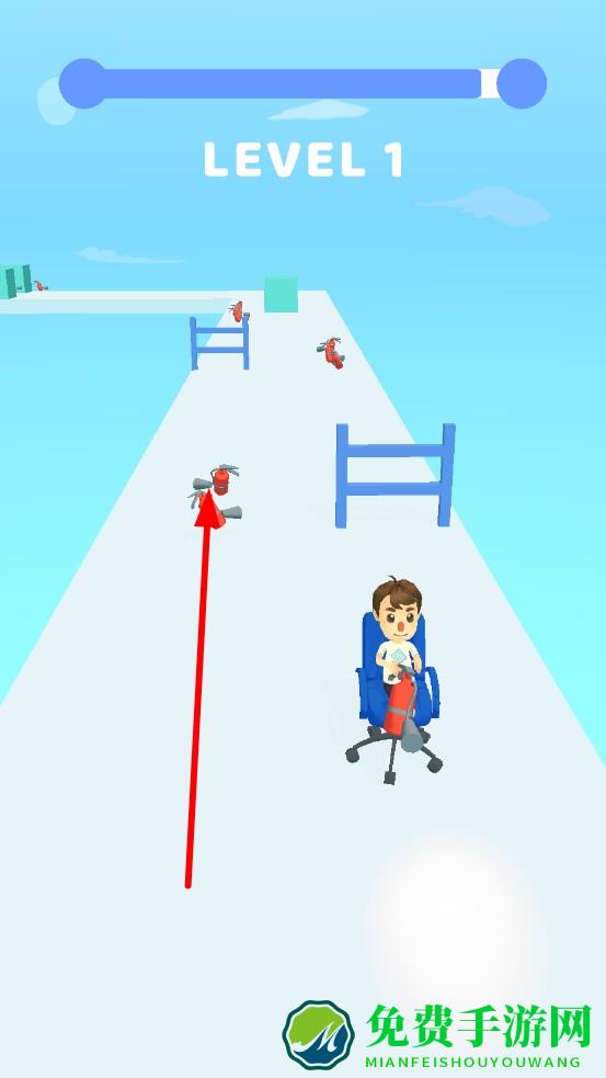 1、进入关卡,滑动操控办公椅转向,点击灭火器喷气加速,优先收集散落在赛道的小型灭火器补充推进剂,避开初始的矮栏障碍。