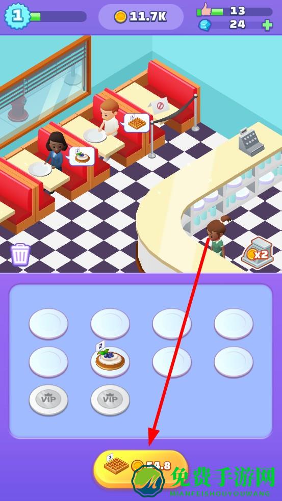 1、进入店铺,观察顾客头顶甜品需求,华夫饼、莓果蛋糕等食物,使用金币解锁,将食物递给客人。