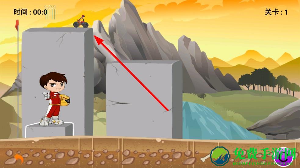1、进入关卡,通过点击屏幕右侧控制摩托平衡,长按加速冲坡,腾空时滑动屏幕触发空翻特技跨越深沟;