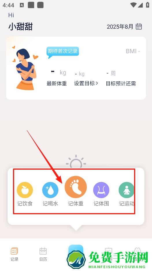 1、首页能显示体重相关信息,你可以设置体重目标,底部有个+按钮,点它就能进入记录各种健康数据的界面,方便你记录日常的健康情况。