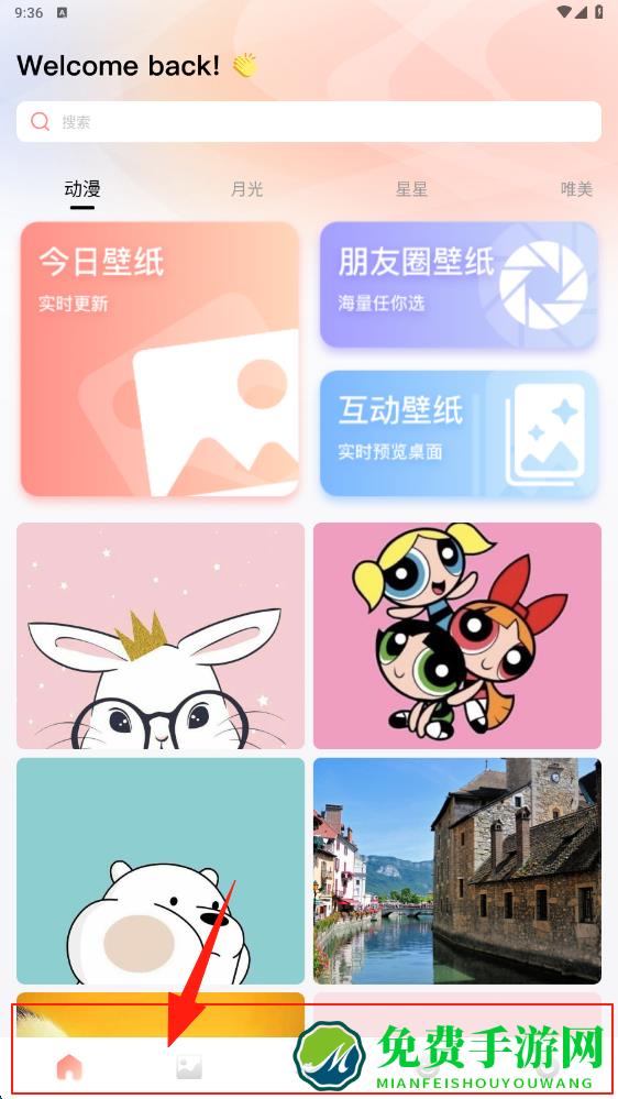 1、在首页可浏览动漫分类壁纸,选择今日壁纸朋友圈壁纸等模块,挑选喜欢的壁纸资源。
