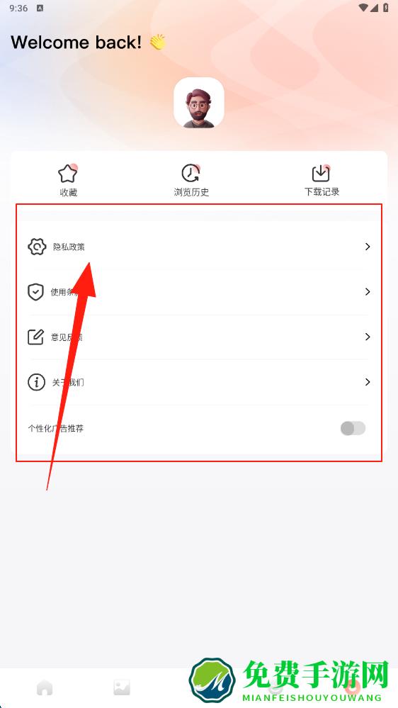 3、在个人页面,可点击隐私政策选项,了解应用隐私相关内容,也能查看收藏浏览历史等。