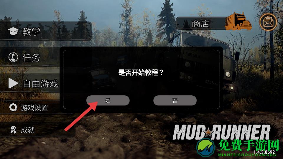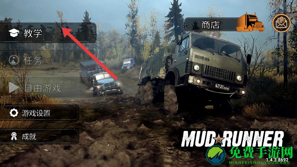 1、进入游戏后选择初始卡车与入门赛道,通过方向盘控制方向,油门与刹车调节车速,在泥泞路面完成首次越野行驶。