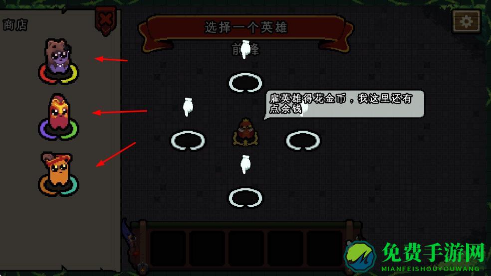 2、进入英雄选择页,消耗金币雇佣左侧英雄如紫色、红色、橙色造型,选定参战角色。
