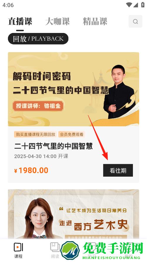 1、有直播课,大咖课精品课这些分类,你可以看到二十四节气里的中国智慧这门课,要是想了解往期的课程内容,点击看往期就行,课程购买后能无限回放。