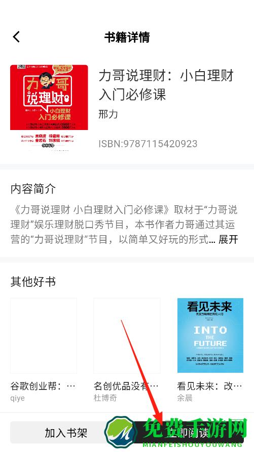 3、这是书籍详情页面,能看到作者,ISBN等信息,还有内容简介,你要是想马上读这本书,点击立即阅读就可以,要是想之后再读,也能把它加入书架,方便下次找到。