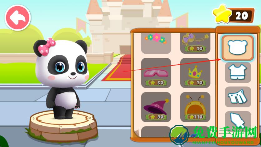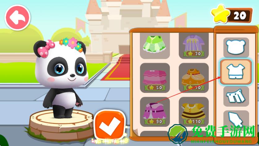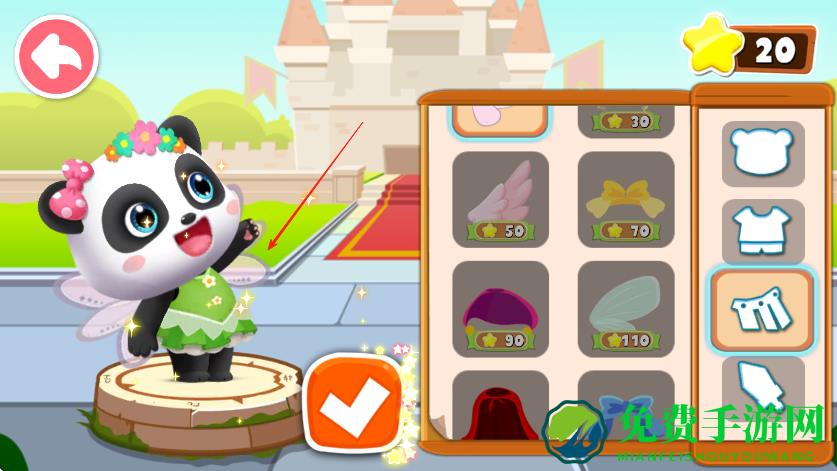 3、点击选中的服饰,将其应用到熊猫角色身上,确认搭配无误后,点击下方√按钮保存换装效果。