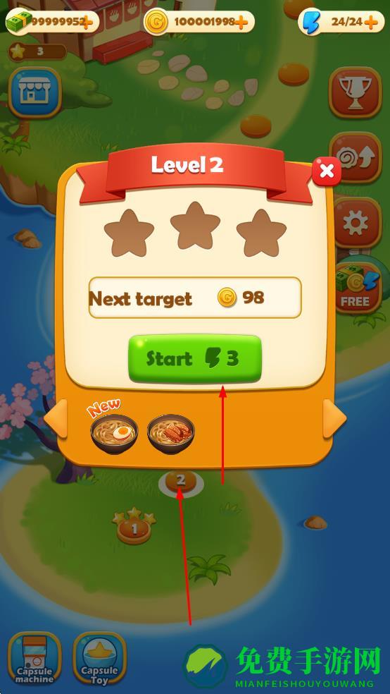 1、选择关卡如Level2,消耗体力3点,目标赚取指定金币98。