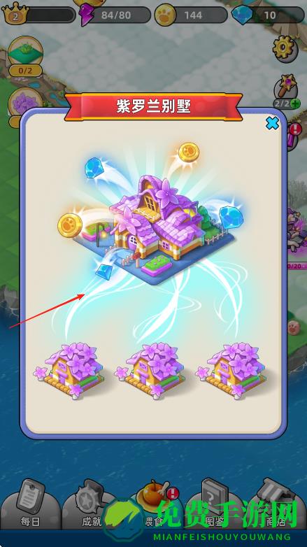 1、留意屏幕上方资源数值,点击建筑查看紫罗兰别墅等,通过合并低级建筑获取高级建筑及金币钻石奖励。