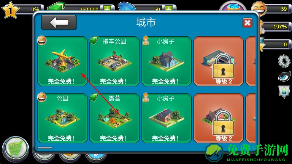 1、进入机场城市装饰界面,点击完全免费建筑,解锁并布置到城市。