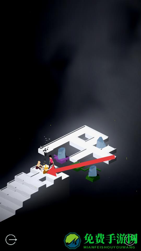 1、滑动屏幕操控红衣角色移动,推动紫色物件、石块,利用其搭建临时通路,跨越场景中的沟壑、台阶等障碍。