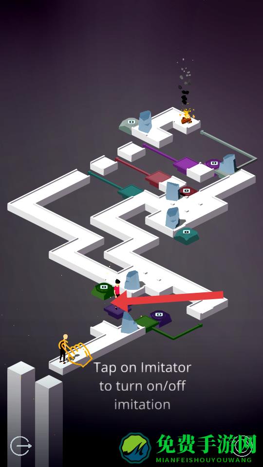 2、当出现Tap on Imitator提示时,点击对应角色激活模仿的机制,使多角色同步动作,紫色等机关互动按压。