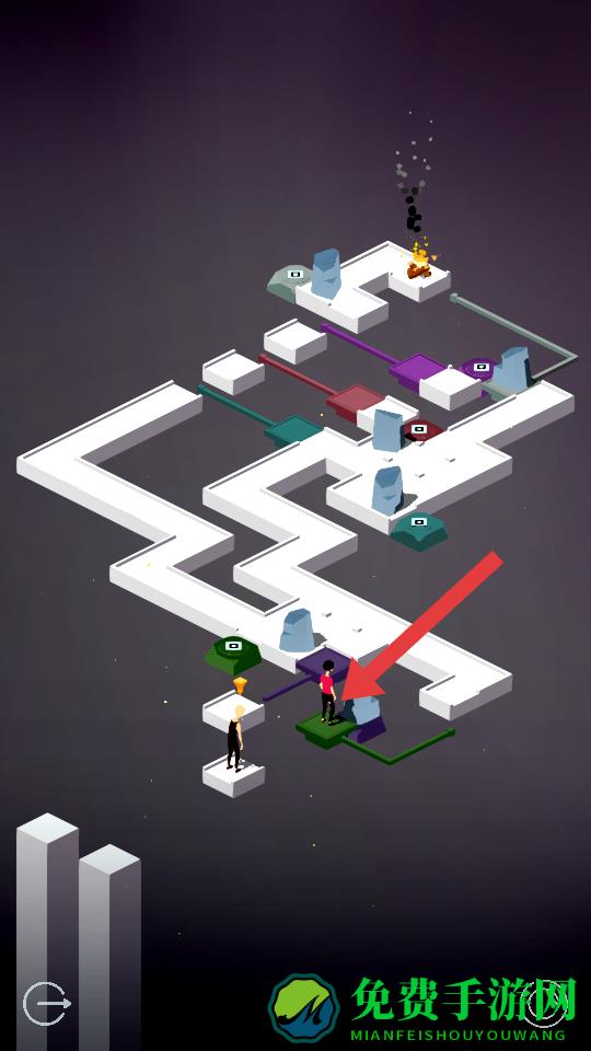 3、持续跟随箭头方向,借助模仿机制联动多角色,依次触发不同颜色机关,打通被石块、墙体阻挡的路线。