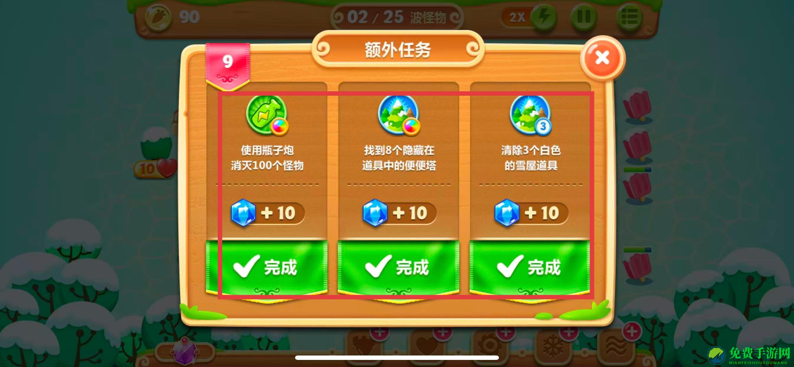 1、查看每一关的额外任务要求,像第9关使用瓶子炮消灭100个怪物、找到8个隐藏在道具中的便便塔、清除3个白色的雪屋道具,一个任务完成即可获得十个晶体。