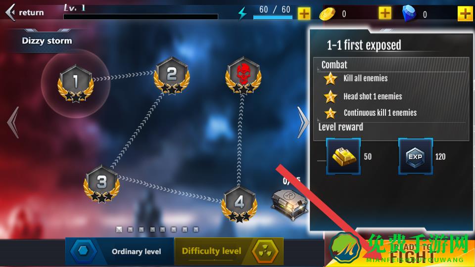 1、进入游戏,主界面点Campaign Mode战役模式,选Dizzy storm章节1-1关卡,查看任务后开始战斗。
