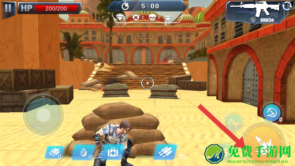 2、战斗场景用左侧摇杆移动,右侧射击、技能按钮攻击,躲在沙袋后卡视野,优先爆头清敌,完成条件。