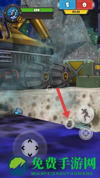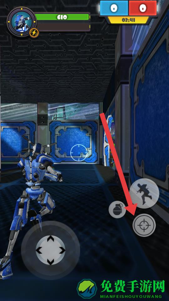 2、遇敌方目标,点击右侧瞄准按钮射击,比分落后时,人形按钮绕后突袭,丢手雷炸弹按钮清场。
