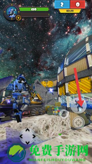 1、进入游戏,用左下角摇杆控制蓝色机甲移动,熟悉太空站场景,通过传送门切换至月球地图。