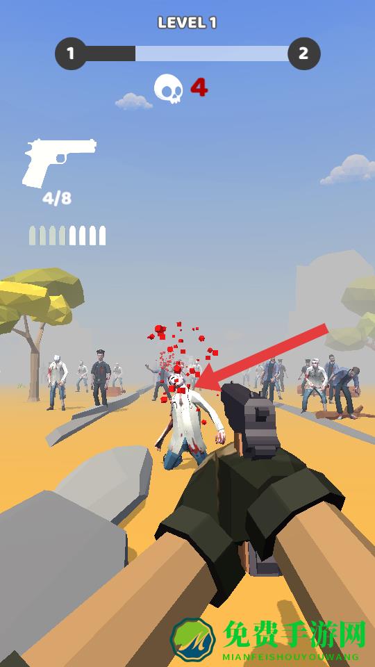 3、循环瞄准-射击-躲围-清场,打完LEVEL1僵尸,进入LEVEL2挑战,收集场景道具升级,提升效率。