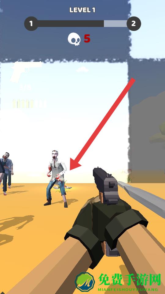 1、进入游戏,按指引用屏幕滑动瞄准,点击射击键打僵尸,优先清近处,留意上方弹药数,没弹换弹。