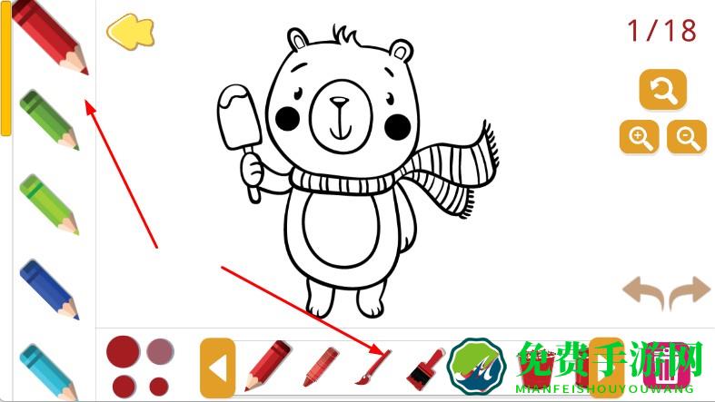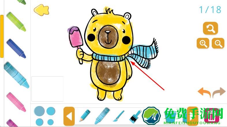 2、进入填色界面,左侧选画笔,下方选对应颜色,如红色、棕色,在图案区域,如小熊身体、围巾等,点击或涂抹上色。