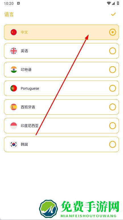 1、打开美颜社,先在语言设置选中文,进入首页后,可通过引导页探索你的内在魅力了解功能,点右下角对勾进入主界面。