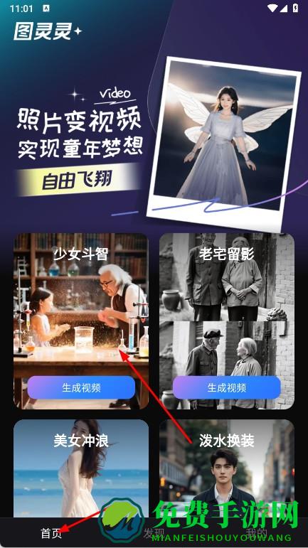 1、打开图灵灵,进入首页,浏览各种照片变视频的模板,如少女斗智,选择感兴趣的模板,如美女冲浪,点击生成视频。