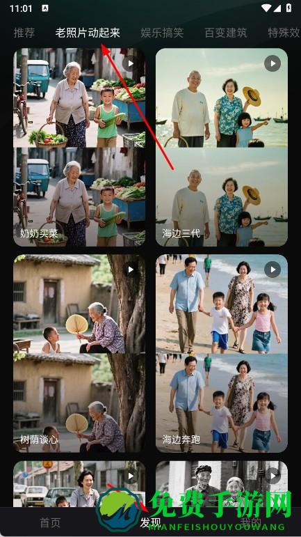2、也可以点击底部发现,在分类,如老照片动起来,娱乐搞笑中挑选喜欢的风格案例,获取创作灵感。