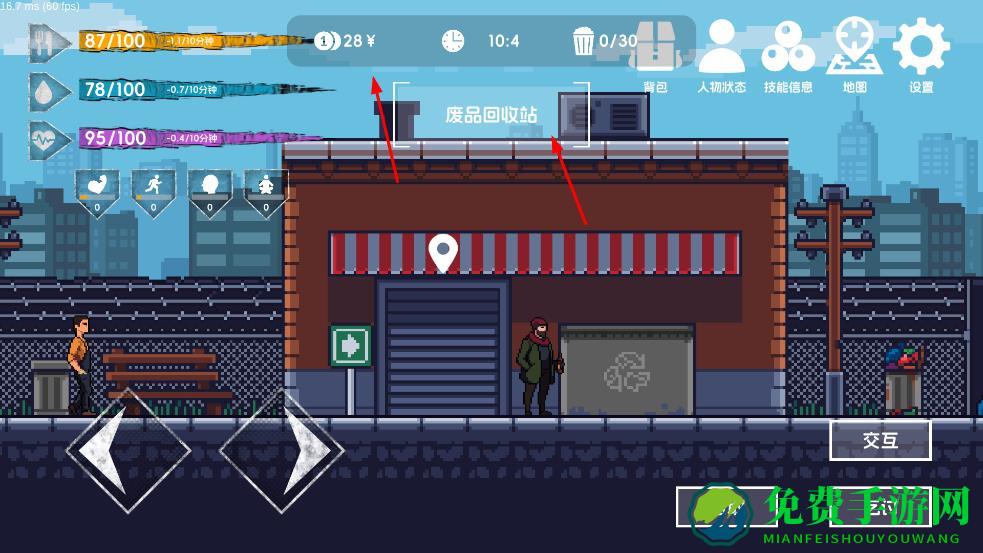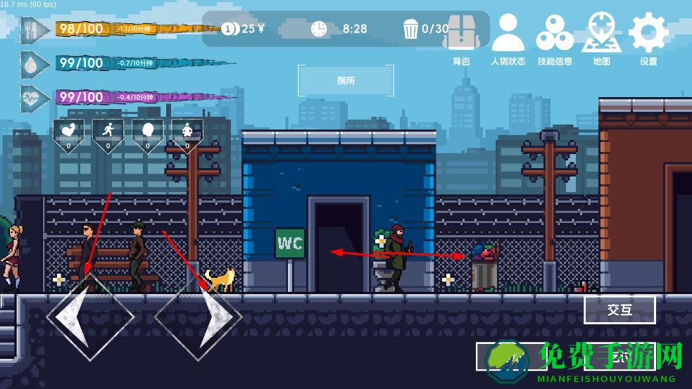 1、操控角色左右移动,在场景中对WC标识处等地点进行交互,还可使用拾取乞讨功能,同时留意人物的饥饿、水分、健康等状态条。