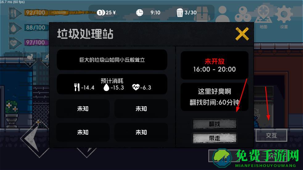 2、找到垃圾处理站后,在开放时间内进行翻找,翻找过程会消耗饥饿、水分和健康值,可获取废品,也能选择带走相关物品。