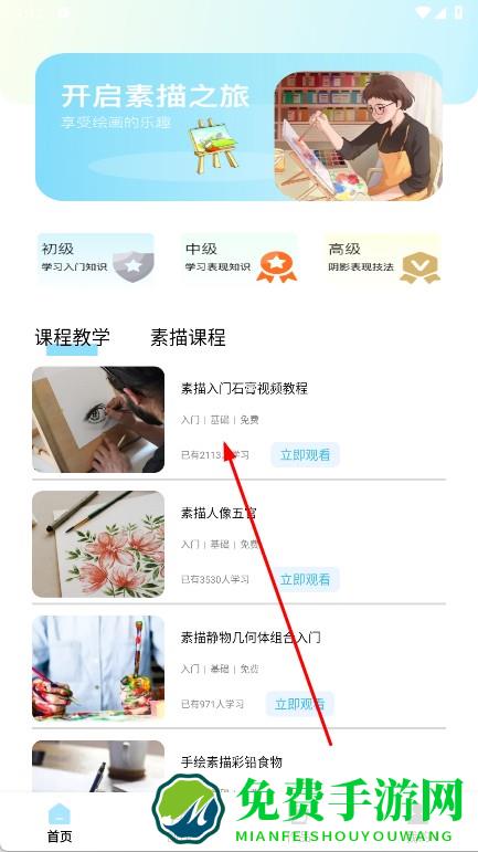 1、打开AR素描大师,进入首页,在课程教学的素描课程里,挑选感兴趣教程,点击立即观看,学习素描知识与技巧。