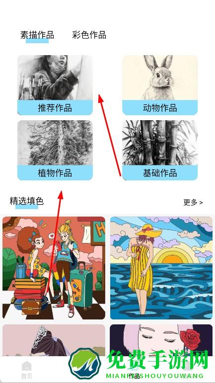 3、进入作品页,浏览推荐作品等各类精品,临摹提升或汲取灵感,利用提供的画笔、颜色,多样化创作素描。