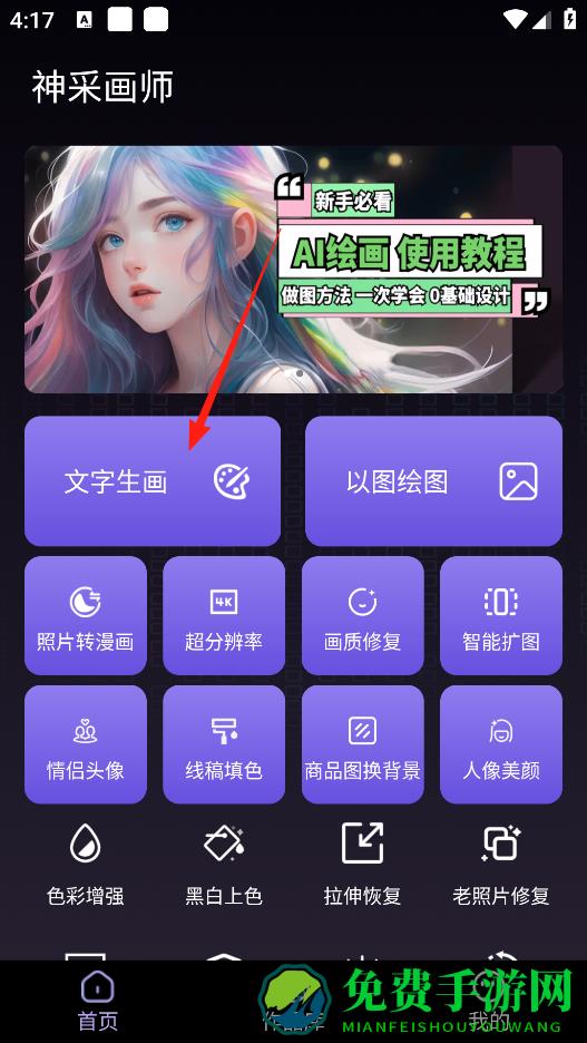 1、这个神采画师软件有文字生画功能,点进去后你可以用文字描述想要的画面,软件就能生成对应的画,另外还有以图绘图,照片转漫画等好多功能,能满足不同的绘画需求。