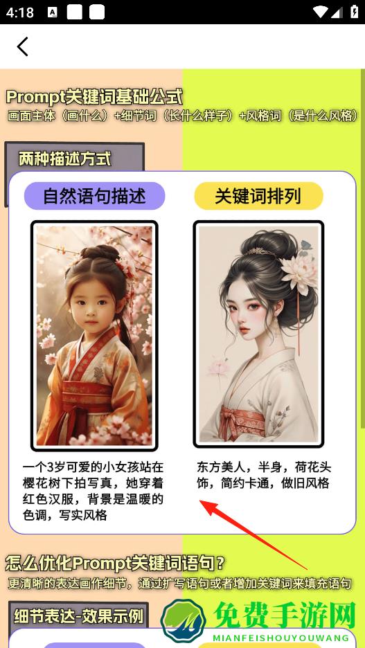 2、在文字生画的提示里,教了两种描述方式,自然语句描述和关键词排列,你可以用自然的句子详细描述画面,也能把关键词列出来,这样生成的画会更符合你的想法。